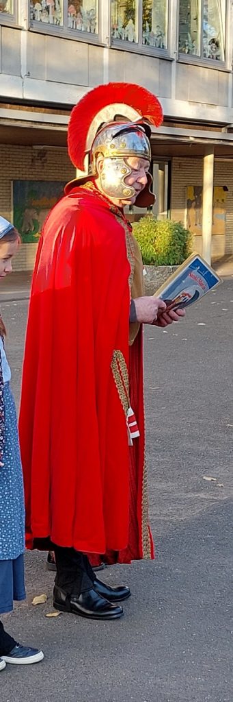 Am 07.11.2025 hat uns Sankt Martin mit den Gänselieseln und dem Bettler in der Schule besucht und wurde von allen mit Martinsliedern begrüßt.